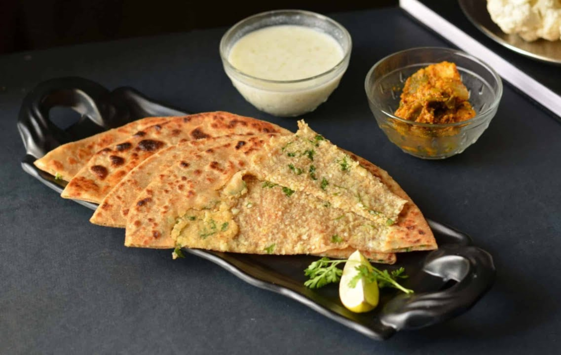 Two crispy gobhi-stuffed parathas packed with desi spices, served hot with fresh curd and tangy pickle for a full desi meal.