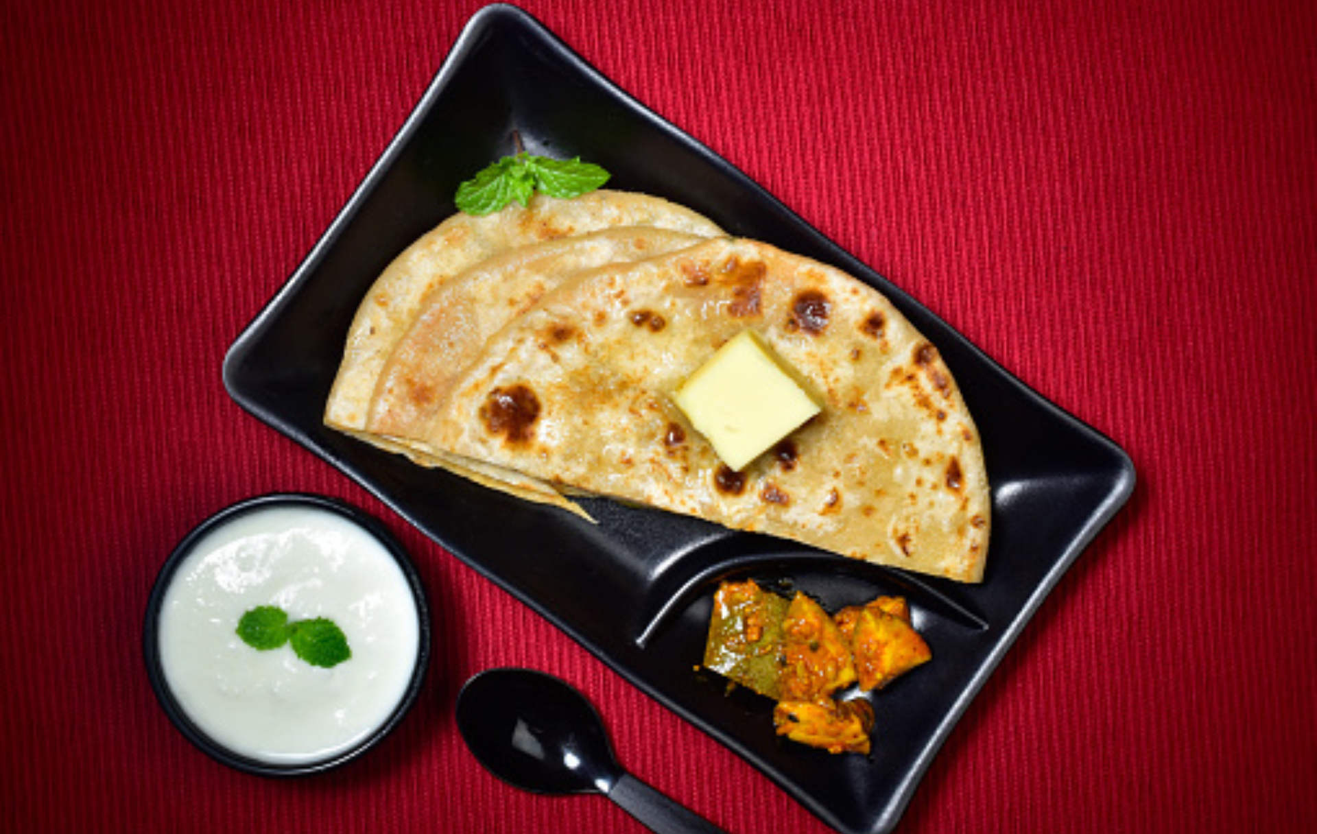 Two hot, crispy parathas stuffed with spicy aloo & fresh pyaj mix, served with creamy curd and tangy pickle for a perfect combo.
