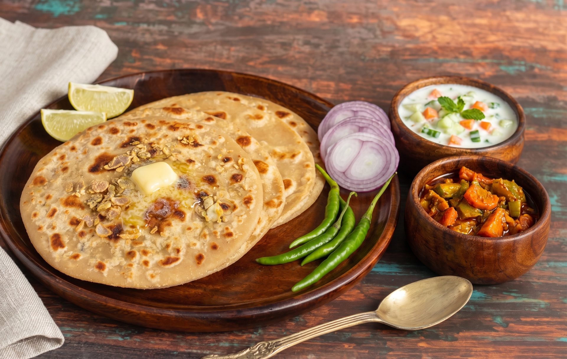 Two authentic sattu-stuffed parathas roasted in desi ghee, served with fresh curd and tangy pickle for a wholesome desi combo.